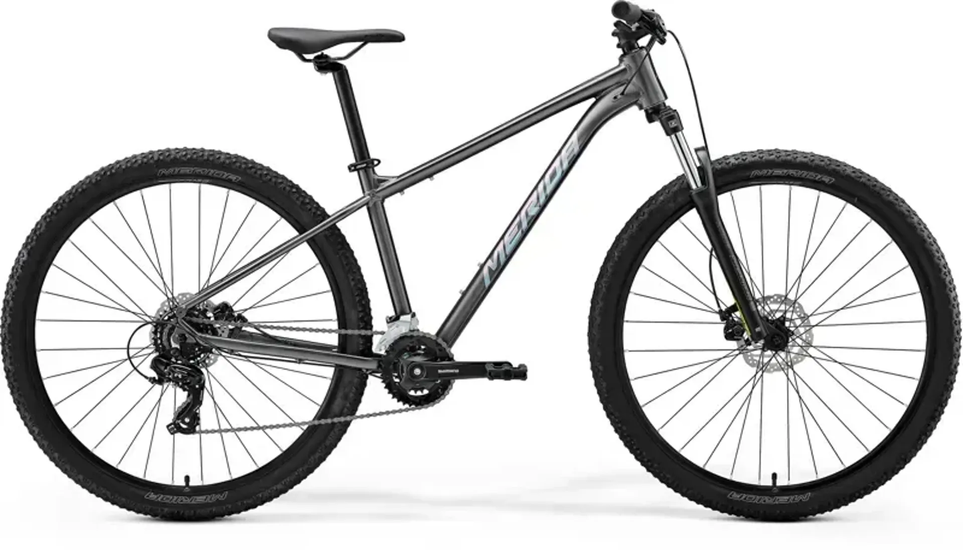 The entry to the world of MERIDA mountain bike hardtails. Merida's latest high-quality TFS frame takes everything they know about aluminium frame manufacturing, with updated geometry that delivers more on-trail performance without losing all-around versatility. The SR Suntour 100 mm suspension fork is paired with fast-rolling 29" wheels to help smooth the bumps and the Shimano disc brakes and 2x7-speed drivetrain deliver reliable and confident performance.